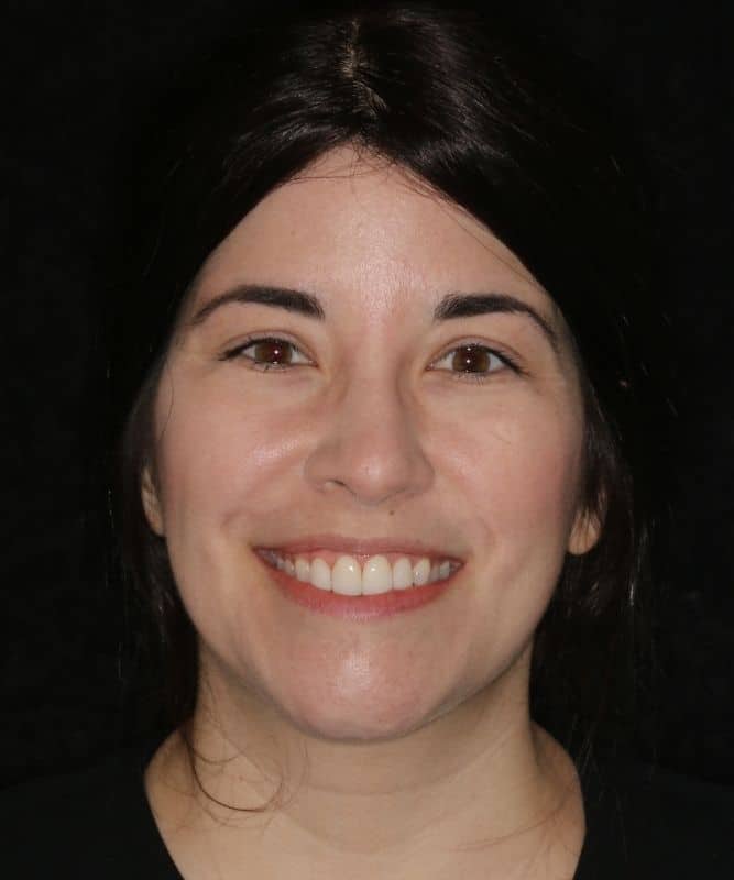 Finally, prepless porcelain veneers were placed on Amanda’s upper front teeth to correct size discrepancies and refine her smile’s symmetry. Because the veneers required little to no tooth reduction, her natural enamel was preserved while enhancing esthetics.
